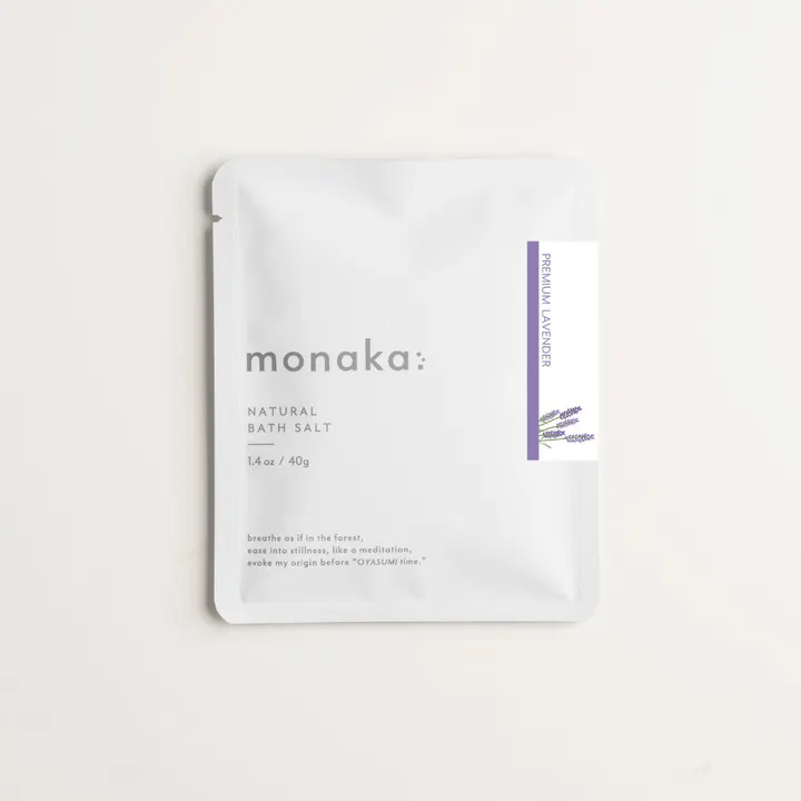 monaka ナチュラルバスソルト プレミアムラベンダー 40g(1回分) / 320g(8回分) 【森の中を歩くような心地よい入浴を】 目指したのは「極上のバスソルト」 花や果実、草木など、自然そのままの香りや色合いを大切に仕上げました。 まるで素材を味わうかのように浸る、優しい入浴時間。 【プレミアムラベンダー】 ラベンダー精油 × ラベンダー花 -優しく心地よい香りが、夜に溶け込む- おやすみ前のラベンダー習慣♪ 芳醇なラベンダーの香りが、あなたを深く優しく包みこむ。 【LINE UP】 〇プレミアムヒノキ 〇プレミアムはちみつレモン 〇はちみつジンジャー 〇ゆずシトラス 〇プレミアムみかん 〇プレミアムラベンダー 〇プレミアムローズ 〇クレイ月桃 〇キャラメルシナモン 〇キャラメルバニラ 【ミネラル豊富で環境にも優しい天然塩】 西オーストラリアの塩田で製造される「シャークベイソルト」を使用。 太陽と風の力で2~3年かけて結晶化させる「天日塩製法」で作られた塩は、環境にも優しいだけでなく、 カルシウム・マグネシウムなどのミネラル成分が豊富に含まれる。 【ヒアルロン酸Na配合】 1gで約6Lもの保水力を誇る、保湿美容成分を配合。 【使用法】 140~160Lのお湯に対して40g程度を目安に入浴前に入れてご使用ください。 付属のメッシュ袋に中身を詰めてお使いください。 【お知らせ】 ●追い焚きしないでください。 ●色や香りが残らないよう、入浴後はすぐに洗い流してください。 ●商品の特性上、LOTや時間で色や香りが変わることがあります。 ●本品は雑貨です。 【販促物】 ◇ブランドカード(A5サイズ) ◇各種香り説明カード(名刺サイズ/縦) ◇共通プライスカード(名刺サイズ/横) ご入用の方は、備考欄にてお申し付けください。 関連ブランド・・・ ◇tamamono organic = 植物の力で心と体を整える / オーガニックコスメ、アロマ ◇WAKAPLUS = 和の香りを日常にプラスする / バスソルト ◇manaplus PRO = 美容サロンなどで使用するプロユースコスメ / キャリアオイル、アロマ ◇KOTOLABO = 京都発のフレグランスブランド / 練り香水、お清めミスト ◇monaka = 素材を味わう10種のバスソルト / ヒノキ、はちみつレモン、ラベンダー など