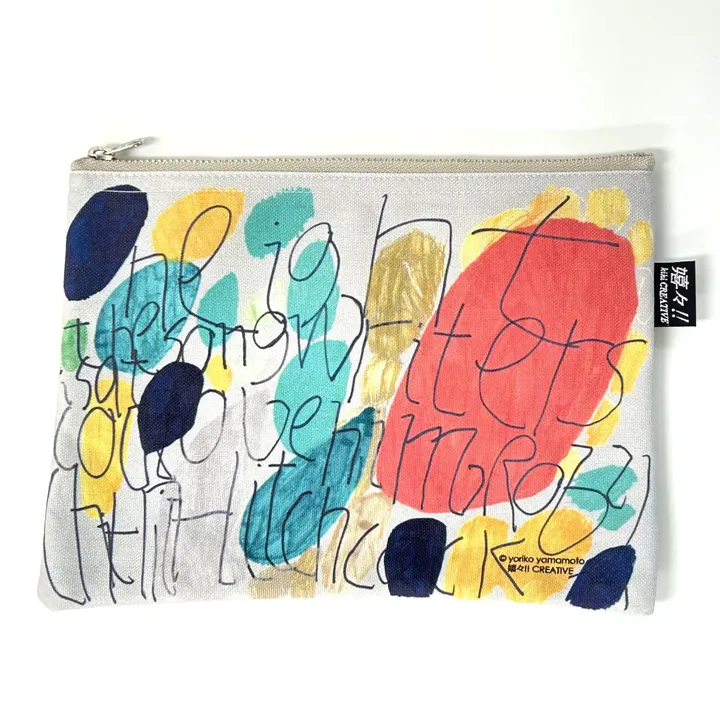 嬉々‼CREATIVEの人気商品! 山本 頼子のアートワークを使用したフラットポーチです。 カラフルな作品を発色良くプリントしてあり、持っているだけで気分が上がります! フラットなフォルムでバッグの中でも嵩張りにくく、通帳が入る持ち運びに便利なサイズ感。 また、内側ビニールコーティング加工で内部の汚れが外に響きにくいです。 筧 淳爾 1975年生まれのベテラン作家。 フェアトレード・オーガニックな商品を取り扱う第3世界ショップのパッケージデザインや、 シューズブランド Le Talonに採用されるなど採用歴多数。 化粧品や花をテーマに選び、ペンでラフに線を引く。色選びには特にこだわっている。 紙に顔をくっつけてインクを染みこませるのを楽しみ、葉脈のように区切りながら塗っていく。 時々添えられる文字はほんわか優しい印象で作家の人柄を表している。 ● サイズ:W210 × H150mm  ● マチなし  ● 11 号帆布 ● 内側ビニール加工  ● ファスナー色 : シルバー お使いのデバイスにより商品写真のお色が実際と異なることがあります。ご了承ください。
