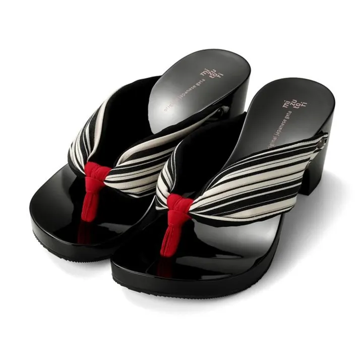 m2(えむに)コラボの「小倉 縞縞」の生地を使用。 小倉織の特徴は細い糸で織り上げた繊細なストライプ。織で表現された上品なグラデーションをお楽しみください。 下駄木地はカシュー漆を施した鏡面ブラック仕上げで上品な1足。