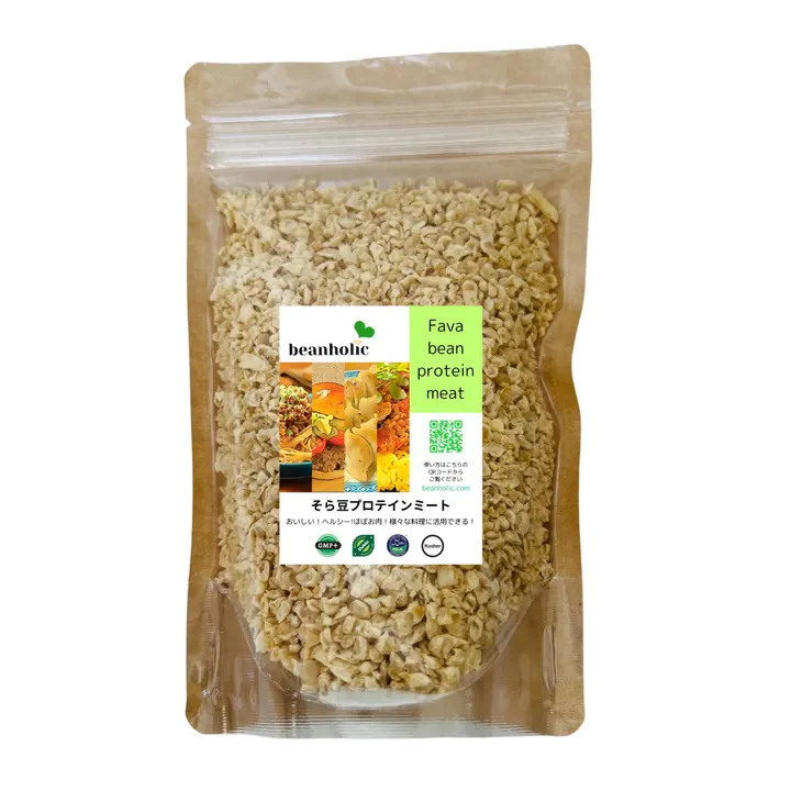 世界的に関心が高まるサスティナブルな食材。 数々のヴィーガンミートが登場する中で、ビーンホリックでは「良質」で「おいしい」プラントベース食品としてノルウェー産の豆由来のテクスチャー・ベジタブル・プロテインを取り入れた商品作りをしています。 大豆アレルギーをお持ちの方でも気軽に食べる事の出来るそら豆を原料とし、さらにタンパク質含有量が60%以上と高タンパク・低脂質を実現したミートなります。豆を粉砕した後、圧縮加工したのみのため、薬剤の使用の無い100%自然由来の商品となります。 【特徴】 感:歯応えあり タンパク質量:60.8% サイズ:1-7mm 形状:ミンチ 代替のイメージ:鶏または豚ひき肉。 ミートソース、カレー、肉じゃが、春巻き、餃子、麻婆豆腐など。 【そら豆プロテインミート/乾燥】 名称 :そら豆加工品 原材料名: そら豆 内容量: 80g 保存方法: 直射日光、高温多湿を避けた暗所に保存 原産国 :ノルウェー ※洗って戻しますと増えます。 80gは洗い方によって前後しますが、おおよそ500g相当のひき肉量になります。 使い方、増え方の目安についての詳細は一番下のリンクよりご確認ください。 【栄養成分表示(100gあたり)】 エネルギー: 355kcal タンパク質: 60.8g 脂質: 5.9g 炭水化物:21.3g 糖質: 8.0g 食物繊維: 13.3g 食塩相当量: 0.650g 商品詳細はこちらを参照ください: https://beanholic.com/meat/ 使い方/戻し方はこちら: https://beanholic.com/meat-howto/ 注:沖縄県への配送はゆうパックになります。 その他の都道府県へは佐川急便での配送となります。