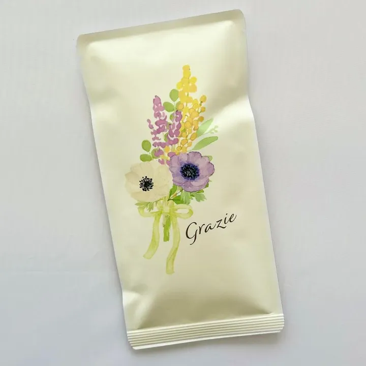 イタリアでのミモザの花言葉は「感謝」。 イタリアでは、ミモザは女性に感謝を伝えるための花として贈られます。 日本のミモザの花言葉「優雅」「友情」。 イタリアでは男性から女性に贈ることが多いようですが、 親しみやすく可愛らしい見た目から、 普段から仲良くしている友人にプレンゼントするのにもおすすめの花です。 イタリア語で「ありがとう」を意味する「grazie」の言葉とともに やさしく香るハーブティーを贈ってみてはいかがですか? 【レモンの香り広がる 和紅茶ティーバッグ】 静岡県掛川市産の和紅茶にレモンマートルというハーブを合わせました。 酸味はなく やわらかな飲み心地に仕上がっております。 ■和紅茶とは? 日本国内で生産・加工がおこなわれている紅茶です。 日本ならではの高い技術が生かされた、甘みとコクのある、上品な味わいが特徴です。 当店の和紅茶は、お茶の名産地である、静岡県掛川市の茶葉を使用し、 絶妙の焙煎によって、旨味を感じる紅茶に仕上げております。 優しい香りで、苦味・渋味成分がなく、ほのかな甘みを感じられます。 お砂糖なしでも大変おいしく頂けます。 食事の時や日常のお茶として気軽に楽しめる紅茶です。 ■レモンマートルってどんなハーブ? 「レモンよりもレモン」 といわれる程、強い柑橘系の香りを放つレモンマートル。 香りの成分「シトラール」が レモンの約20倍含まれています! ■シトラールの効果・効能 抗菌作用があり、皮膚の炎症を抑える働きがあります。 ニキビや湿疹などの皮膚トラブルを解消し 美肌に◎ 風邪の予防にも◎ シトラールの香りには、高ぶった感情を落ち着かせる作用もあります。 ■ おいしい入れ方 カップにティーバッグを 1つ入れてください。 カップにお湯を注ぎ約30秒待ちます。 ティーバッグを数回上下させ きれいな色になったら飲み頃です。 氷を入れたらコールドドリンクの出来上がり! ■裏面のデザインを、『郵送用』『手渡し用』からお選びいただけます。 【郵送用】 切手を貼ってポストに投函するだけで 煎茶ティーバッグを 手紙のように送ることができます。 余白に自由に書き込み可能! ボールペン、サインペン、鉛筆などで簡単に書くことができます。 プチギフトにもおすすめです。 【手渡し用】 余白に自由に書き込み可能! ボールペン、サインペン、鉛筆などで簡単に書くことができます。
