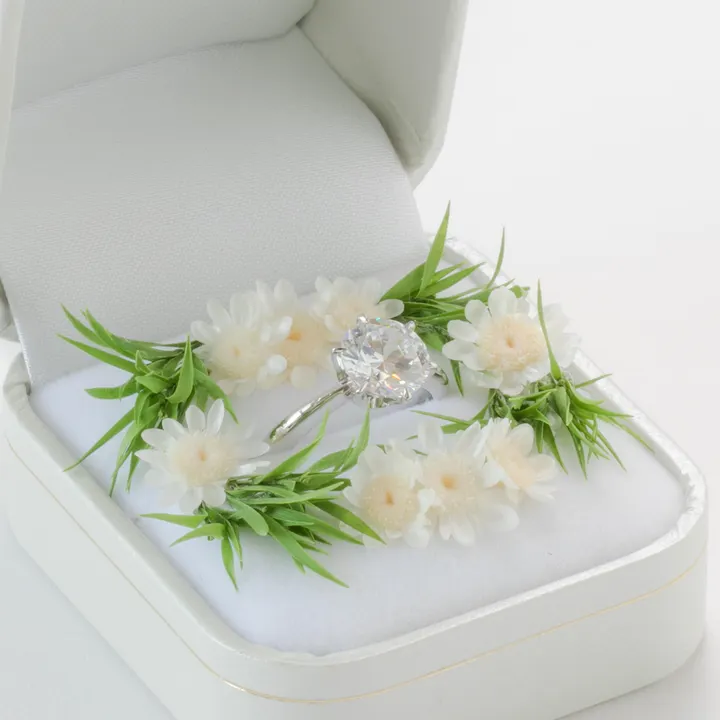 ※高温多湿の場所で保存しますと、他所への色移りの恐れがございます。プロポーズ前・特にプロポーズ成功後はフタを開けて保存いただきますよう、お願いたします。 ※リースの色・お花の雰囲気・イメージは統一していますが、全てプリザーブドフラワーとドライフラワーを使用した1点1点の手作り商品ですので、写真と若干仕様・色合いが異なる場合がございます。 ※プリザーブドフラワーは生花に特殊な加工を施し、枯れる事がなく数年美しい状態を楽しめる素材です。ドライフラワーは自然の花・葉などを乾燥させた素材です。どちらも保存状態により多少の色変わりがございます。 ※配送の際、稀に微量の素材塵がでる可能性がございます。お手数ですが、遠目からドライヤーの弱冷風を当てたり、ティッシュなどの柔らかい布等で吹き払ってください。 リングカラーとリングサイズは備考欄でご指定ください。 ※リースは繊細な作りとなっておりますので、リングケースの開閉等のお取り扱い際には、充分にご注意ください。 ※シルバー商品は空気中に含まれる成分・汗などに反応し、変色する特性がございます。月に一度ほど柔らかい布で拭くなど、お手入れください。