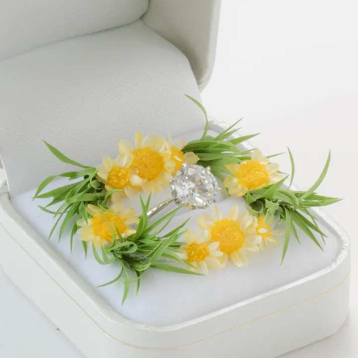 ※高温多湿の場所で保存しますと、他所への色移りの恐れがございます。プロポーズ前・特にプロポーズ成功後はフタを開けて保存いただきますよう、お願いたします。 ※リースの色・お花の雰囲気・イメージは統一していますが、全てプリザーブドフラワーとドライフラワーを使用した1点1点の手作り商品ですので、写真と若干仕様・色合いが異なる場合がございます。 ※プリザーブドフラワーは生花に特殊な加工を施し、枯れる事がなく数年美しい状態を楽しめる素材です。ドライフラワーは自然の花・葉などを乾燥させた素材です。どちらも保存状態により多少の色変わりがございます。 ※配送の際、稀に微量の素材塵がでる可能性がございます。お手数ですが、遠目からドライヤーの弱冷風を当てたり、ティッシュなどの柔らかい布等で吹き払ってください。 リングカラーとリングサイズは備考欄でご指定ください。 ※リースは繊細な作りとなっておりますので、リングケースの開閉等のお取り扱い際には、充分にご注意ください。 ※シルバー商品は空気中に含まれる成分・汗などに反応し、変色する特性がございます。月に一度ほど柔らかい布で拭くなど、お手入れください。