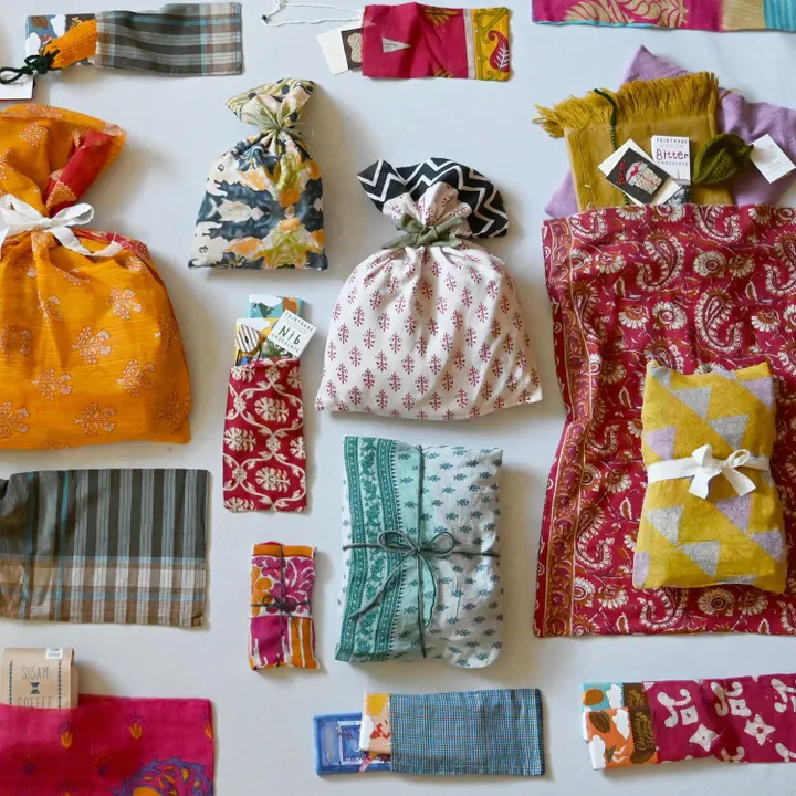 「心躍る柄のオクリモノブクロ」 インドの伝統民族衣装のサリーやルンギ(腰巻布)をリサイクルして作られたシンプルなラッピング用の布袋です。 かつて誰かの暮らしを彩っていたお洋服の生地を、インドのフェアトレードパートナー「SASHA(サシャ)」の作り手によって 袋状に縫い合わせています。 シサム工房は”何でラッピングするか”ということも大切にしています。 1つのギフトで2つの笑顔。 皆さまの大切な人と作り手の笑顔を繋ぐ「フェアトレードギフト」のご提案です。 ラッピングの後は何に使おうかな・・・と考えるのも楽しみのひとつ。 取っ手を付けてエコバッグにしたり、 旅行のときの仕分けに便利な「トラベルポーチ」にもなりそうですね。
