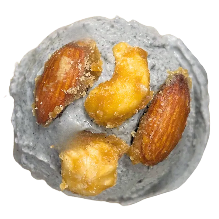 【黒胡麻キャラメルナッツ】 香ばしい香りの黒胡麻ペーストをたっぷりと使用した なめらかでスイートなミルクベースのアイス 少しソルティなナッツのキャラメリゼをトッピングしました * アレルギー情報 乳成分・ナッツ類 店内のキッチンで 少量ずつ丁寧に手作りしたアイスクリームす。 保存方法: -18℃以下で保存
