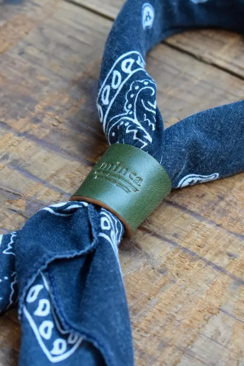 光沢感のある上品なバンダナホルダーです。 お手持ちのバンダナやスカーフにアクセントを。 【革製品のお取り扱いについて】 ・水分、油分、日光などにより、色落ちや変色の可能性があります。 ・全ての革の表面に顔料仕上げ等の特別な処理を施していない為、汗や雨などで濡れた布に革の色が移る場合がありますのでご注意ください。 ・デニム生地と触れると色移りしてしまう場合があるのでご注意ください。 ・水に濡れた際は、速やかに乾いた柔らかい布でたたくように水気を取り、直射日光を避けて風通しの良い場所で乾燥させてください。 ・保管する際は、風通しの良い場所に紙などを中に詰めて形を整え、付属の布袋などに入れて保管してください。 ・定期的にワックスやケアブラシを使ったお手入れをして頂くと、汚れの軽減や、乾燥防止になります。