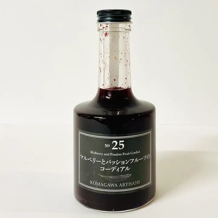 熊本県人吉球磨地方の西の端、霊峰市房山の麓の水上村湯山地区は水も空気も人も美しいマジカルな場所。ここで生産者さんたちが桑の実(マルベリー)を農園で栽培する試みが生まれました。深い紫色の実はポリフェノールがいっぱい。この小指の先ほどの小さい果実を集めて作ったのは、同地が産地のイチゴの果汁をベースに、同じ熊本県で育ったパッションフルーツをブレンドした、目にも美しく、味わうと元気が湧いてくるようなフルーティさが際立つフルーツシロップ、コーディアルです。炭酸や乳酸飲料で割ったり、オレンジジュースやリンゴジュースとブレンドしても美しくおいしいです。カクテルに使うグレナデンシロップの安心安全な代用にもお試しください。