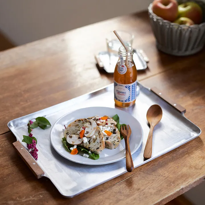 毎日の食卓にひとつあると便利なトレー。アカシアウッドの持ち手があたたかみを感じさせてくれます。キッチンから食卓へ、食事を運ぶお盆としてはもちろん、ほっと一息入れたいランチタイムやお庭でのリラックスタイムにもおすすめ。 アルミニウム(アルミ)は、軽くて丈夫で熱や電気を伝えやすい、製品の加工がしやすく、使い終わった後のリサイクルも容易で優れた特徴を多く持つ金属です。その丈夫な素材から自動車やパソコンなどの部品、航空機の機体などにも使われています。 職人が一点ずつ手作業で制作しているため、同じ商品でも色・形・大きさ等に違いが生じる場合があります。素材の特性上、濡れたものを入れたり、水気・湿気の多い場所でのご使用は錆びが発生する場合がありますのでご注意ください。また、ヒビ・欠け・強いスリ傷等が入った場合は、思わぬ時に破損することがありますので使用しないでください。繊細に作られているため、落としたり強い衝撃を与えたりすると割れることがありますのでご注意ください。