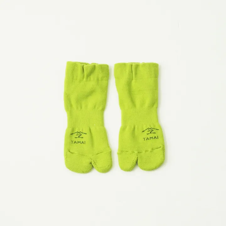 日々の暮らしを、少しだけ楽に。 そんな思いから生まれた、足袋ソックスです。 足口のゴムをあえて半分にすることで、締め付けを和らげました。長く履いても快適にお過ごしいただけます。 特殊加工により伸びが良く、男女問わず快適に着用可能。 足底部分にはパイル編みを採用し、クッション性と耐久性に優れているため、日常使いはもちろん、アクティブなシーンにも対応します。 スポーティなモデルでありながら、ストリートな表情も持ち合わせたデザインは、カジュアルな装いから都会的なスタイルまで幅広く活躍します。 表糸には抗菌防臭加工を施した綿100%糸を使用し、肌にやさしく清潔で快適な履き心地をお届けします。 確かな品質の日本製。毎日の足もとを支えながら、スタイルにも遊び心をプラスする一足です。