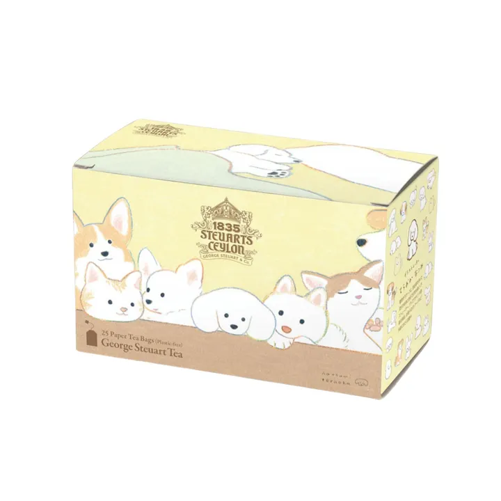 【てらおかなつみ×George Steuart Tea】コラボ紅茶 「かわいい×おいしい」ティーバッグセット(ミニシール付き) 人気イラストレーター、てらおかなつみ氏の犬イラストがかわいい コラボ紅茶です。ジョージスチュアートティの5種のフレーバーが5袋ずつ、 合計25袋入りに加えて、てらおかなつみ氏が描き起こした オリジナルシール3種のうち1つがランダムで入っています。 (シールの選択はできません) 1袋ずつアルミ個包装されていますので、 持ち運びに便利で香りが長持ちするティーバッグタイプ。 【てらおかなつみ氏】 犬や動物がモチーフにの“ほっこり”した作品で人気を集めるている 人気イラストレーター。 色鉛筆で描かれる柔らかな線と色彩が特徴で、グッズデザインや書籍の挿絵、 お菓子のパッケージなど多岐にわたって活躍中です。 国内外のギャラリーで個展を開催するなど、“やさしさ”と“ぬくもり”に満ちたアートは、 幅広い世代に支持されています。 【フレーバー紹介】 ●ライチ・ティー 瑞々しく華やかな香りのライチのフレーバー。 適度な甘みと酸味が香るライチと紅茶のマリアージュをお楽しみいただけます。 紅茶のボディ感はミディアムで、渋みは軽やか。大人のフレーバーティーになっています。 アイスティーにもおすすめ。 ●ピーチ・ティー 強い光の中で育った奥ゆかしい甘さの桃を彷彿とさせる 品のあるアロマを楽しめる紅茶です。 上質なスリランカ茶葉との絶妙なバランスにより、 大人のフレーバーティーとしてお楽しみいただけます。 ミルクティー、アイスティーにもおすすめ。 ●クィーンズチョイス George Steuart設立175周年を記念して英国女王に献上した特別な紅茶。 甘酸っぱい香りと爽やかな風味が特徴です。紅茶、緑茶、矢車菊(ヤグルマギク)、 バラの花びらを使ったユニークなブレンドで、 程よい酸味を含みます。女性だけではなく 男性人気も高いフレーバーです。 ペアリング:オイル系パスタ、ベリー系のケーキ、デニッシュ、チョコレート アイスティーにもおすすめ ●チョコレートドリーム ベースとなる紅茶に1250mの高地で栽培されたやや軽めの茶葉をセレクト。 深味のあるチョコレートのフレーバーは個性豊かで、紅茶の軽やかな渋さと相まって、 ほろ苦く大人っぽい味わいになっています。 アイスティーにもおすすめ ●ヴィンテージアールグレイ スリランカで最も標高が高い茶園で栽培された青葉のニュアンスのある茶葉に、 ベルガモットの香りを合わせました。 個性的なシトラス系の香りで、世界中に愛飲家がいます。 冷たくしても損なわれない力強い香りで、アイスティーにも最適です。 ペアリング:洋風の朝ごはん、チーズケーキ、チョコレート アイスティーにもおすすめ 【内容量】50g(2g×5種×5袋) 【お届けの状態】常温 【アレルゲン】なし 【賞味期限】製造から3ヵ月以上 【原産地】 スリランカ (スリランカ産茶葉100%使用) <George Steuart Tea(ジョージスチュアートティ)とは> George Steuart は、1835年に英国人船長James Steuartによって設立された、スリランカ(前セイロン)で最も歴史の古い紅茶メーカーです。内戦前はセイロンという国名だったスリランカ。スリランカでピンと来ない人も、「セイロンティー」は聞いたことがあるのではないでしょうか。英国からの独立後も紅茶文化は残り、国策として茶園国有化まで計画され、同社もその計画に深く関わっています。「インド洋の真珠」と謳われるほど美しく肥沃な土壌は、茶園を作るのに最適だったのです。180年以上を経た現在でも、手摘みの伝統的な技法で作られる同社の紅茶ですが、現代の嗜好に合わせて少しずつ新しいフレーバーを開発。革新的な老舗として世界中で愛されています。日本では、2014年、当時の在日スリランカ大使の推薦もあって正規販売が始まった、まだ新しいブランドです。 <George Steuart Teaが選ばれる理由> George Steuart Teaは、英国女王陛下に献上し感謝状をいただいたこともある、格式高い紅茶です。スリランカ産の茶葉を100%使用し、伝統的技法で一貫製法されています。一方で、現代人のスタイルに合うよう、リーフ以外にもトライアングルバッグ、気軽に試せるティーバッグなど、多数ご用意しています。フレーバーも、定番からオリジナルまで20種以上と多様。必ず好みのフレーバーが見つかるラインナップです。また、香りも風味もフレッシュなので、ストレートはもちろん、アイスティーやミルクティーでも美味しくいただけます。 日本での販売が始まってわずか2年で、ANAのビジネス・ファーストクラスに搭載、さらに翌年にはANAの全てのラウンジにも採用され、着実にファンを増やしています。