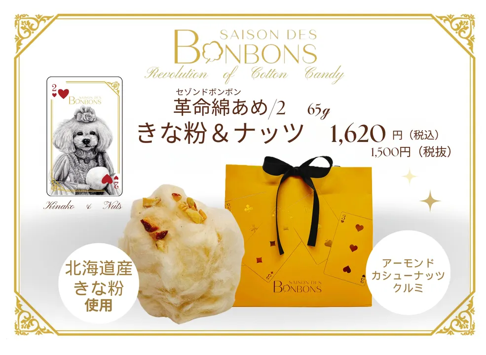 これまでなかった口の中でフワッと広がる、新食感綿あめに、ナッツやチップスが噛み応えの加わった進化系綿あめ「Saison des Bonbons(セゾンドボンボン)」の革命綿あめ。 人工着色料は使用せず、北海道ミルク使用のチョコレート、北海道産きなこ、京都宇治抹茶など産地にこだわった食材を使用。 子供はもちろん大人も満足できる本格綿あめとなっております。 これまでの綿あめの概念を覆す新感覚スイーツです。 北海道ミルクチョコ&ナッツ 沖縄紅芋&紅芋チップス 北海道きな粉&ナッツ 黒ゴマきなこ&ナッツ 京都宇治抹茶&ナッツの5つの味展開。 商品イメージは、カードゲームの「Revolutionary Career Porker」にかけて、革命を起こすトランプ4枚をショッパーにデザインし、革命綿あめを手に、大富豪を夢見る楽園の動物たちのデッサンをパッケージに使用。豪華な衣装をまとった犬や猫のデッサンが目を引きます。 大切な人へのプレゼントに、自分へのご褒美にぜひご賞味ください。