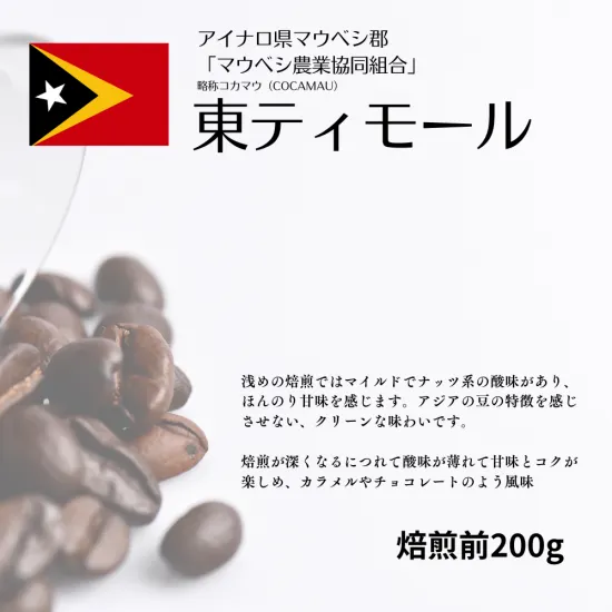 東ティモールの大自然が育む、無農薬・有機栽培コーヒー 東ティモールのアイナロ県マウベシ郡は、標高1,300〜1,700mの山間部に位置し、日中は陽射しが強く、朝晩は冷え込むという厳しい気候条件の中で、おいしいコーヒーが育つ絶好の環境に恵まれています。年間降雨量も豊富で、自然の恵みを受けたマウベシ地域のコーヒーは、1960年代から栽培が広がり、小規模な農家によって丁寧に育てられています。 この地域で生産されるコーヒーは、マウベシ農業協同組合(COCAMAU)によって管理され、2007年には有機JAS認証を取得した無農薬・有機栽培コーヒーです。安心・安全なコーヒーをお楽しみいただけます。 浅めの焙煎では、ナッツ系の酸味とほのかな甘味が感じられる、マイルドでクリーンな味わいが特徴です。アジア産の豆らしいクセが少なく、すっきりとした飲み心地を提供します。焙煎が深くなると酸味が抑えられ、カラメルやチョコレートのような甘味とコクが際立ちます。 焙煎をお任せいただいた場合は、バランスの取れたシティローストでお届けいたします。アイスコーヒーやカフェオレで、しっかりとした苦味を楽しみたい場合には、深煎りをおすすめします。 東ティモールの豊かな自然が育んだ、特別な一杯をぜひお試しください。 生豆もご用意しております。お気軽にご相談ください。 挽き方は粗挽き、中挽き、細挽き、極細挽きからお選びいただけます。抽出器具を記入いただければ合わせた挽き方でお届けいたします。