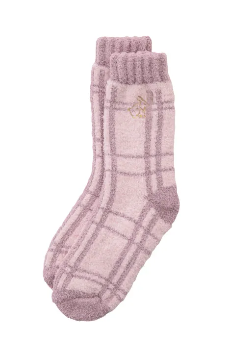 ギフトにもぴったりなもこもこ素材のルームソックス。 しっかりとした厚みが寒がりさんにピッタリ。 配色の格子柄が目を惹きます。 ウサギ/ キツネ/ クマのゴールド刺繍がそれぞれワンポイント入っています。 パッケージはリボン付のオーガンジー巾着となる予定です。 中の柄が透けて、なんだか特別感のある1足に。 ギフトにおすすめです。