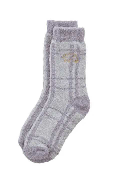 ギフトにもぴったりなもこもこ素材のルームソックス。 しっかりとした厚みが寒がりさんにピッタリ。 配色の格子柄が目を惹きます。 ウサギ/ キツネ/ クマのゴールド刺繍がそれぞれワンポイント入っています。 パッケージはリボン付のオーガンジー巾着となる予定です。 中の柄が透けて、なんだか特別感のある1足に。 ギフトにおすすめです。