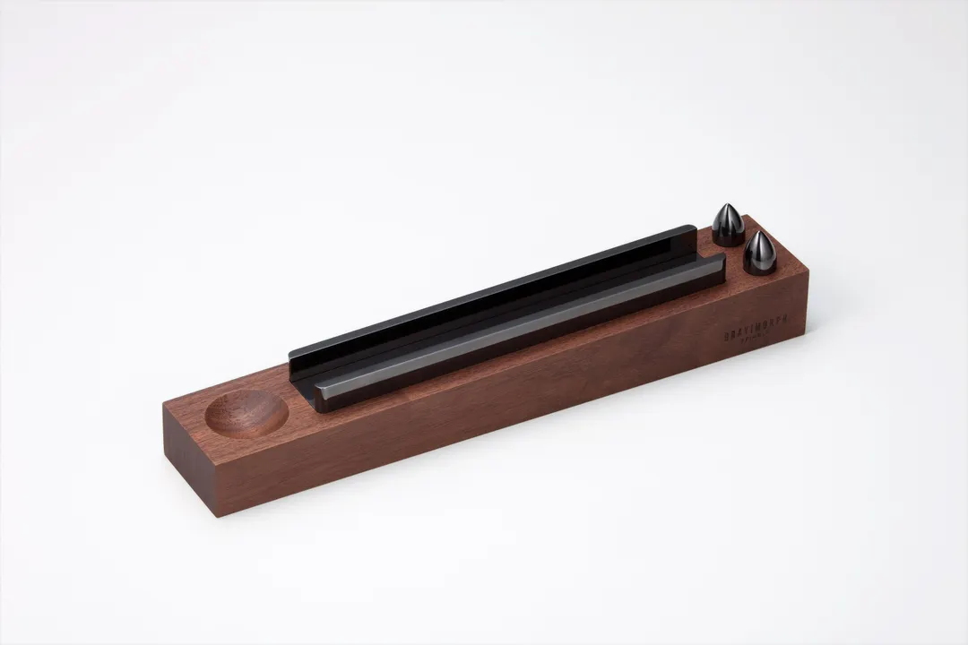 スピンドル ブラック / プレミアムシリーズ SPINDLE(スピンドル)は坂道に2枚の壁を作り、その間に紡錘の形をしたモノを転がしたときに生まれた作品。紡錘の形をしたモノが、両側の壁に交互にゆっくりぶつかりながら心地よい音を奏でて下りていきます。 Blackのステンレス部分には特殊な黒染め工程を施してあります。ステンレスの黒染め工程はとても珍しく、特殊な技法によりおこなわれています。塗装やメッキと異なり、商品1つ1つが個性ある表情をみせ、時間とともに経年変化を楽しむことができます。 Blackの木材にはウォールナットを使用。この厚みのウォールナットの無垢材は非常に貴重なものです。その貴重な木材を使い、燕三条の木工職人が丁寧に加工をしました。 プレミアムシリーズでは、厚さ2ミリの板状の”紙”の素地(芯材)に紙を貼り合わせVカット加工という方法で仕上げた、まるで木箱のような高級感のあるGRAVIMORPH専用BOXでお届けします。 【注意事項】 ・本製品は水平な場所に置いてご使用ください。少しの傾きでも動きと音に影響ができます。 ・本製品は金属部品と木工部品が分解できます。部品によっては表裏で表面処理内容が異なる部品もあるので組立にご注意ください。 ・金属部分の黒染加工は加工の性質上全てが同じ仕上がりにはなりません。また時間とともに経年変化してきます。 ・天然の木材を使用しているため、木目や色味がそれぞれ異なります。 本製品は精巧な製品です。落としたり, 強い衝撃を与えると破損の原因となります。 ・火のそばやストーブのそば、直射日光の強いところや炎天下の車内などの高温の場所で使用、放置しないでください。 ・水に濡れた場合は速やかに柔らかい布で水分を拭き取ってください。 ・乳幼児の手の届かないところに保管してください。