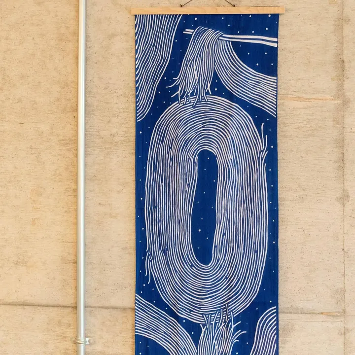 阿久根というまちをあらわすそうめん流しのデザインの手ぬぐい。 印染という大漁旗を作る伝統技法のなかでも、 型置き染めという技法で染められた手ぬぐいです。 色落ちに強く、吸水性があるため普段使いにはもちろん、 アウトドアや温泉にも活躍するアイテムです。