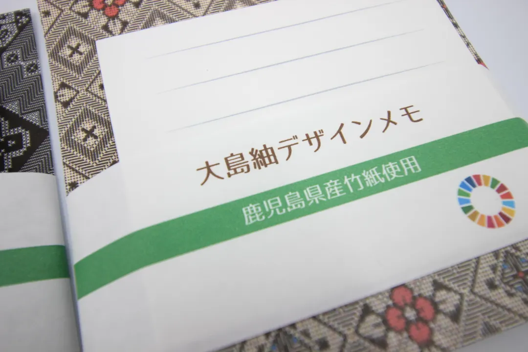 奄美の和雑貨シリーズ「紬ぐ TUMUGU」は、奄美が世界遺産登録になった年に、奄美の新特産品をつくりたいという気持ちから生まれた商品です。 大島紬のデザインで作られたメモ帳は、鹿児島県産の竹紙を原料として製造されており、SDGsの12「つくる責任、つかう責任」に取り組んでいます。 竹紙は環境にやさしいだけでなく、触り心地もサラサラしており、その使い心地から、リピートのお客様も増えております。 メモ帳は50枚綴りです。