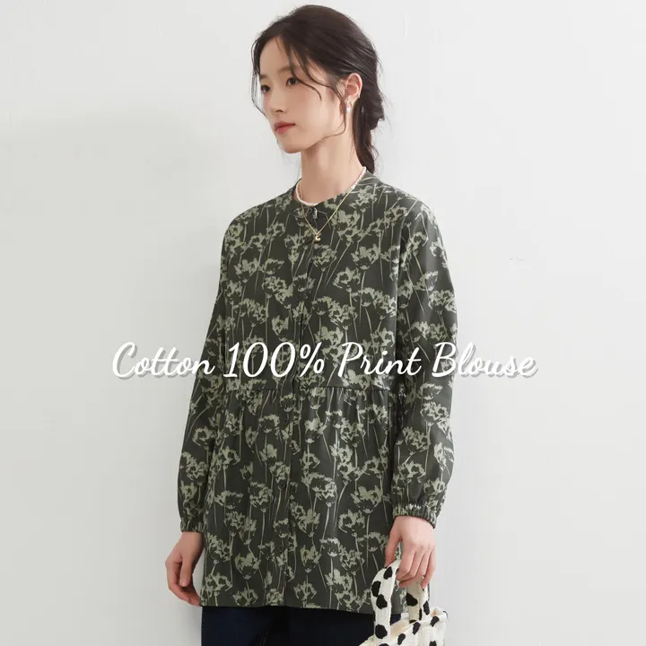 KNXC527・綿100%深緑のプリントギャザー切替ブラウス GREEN-L