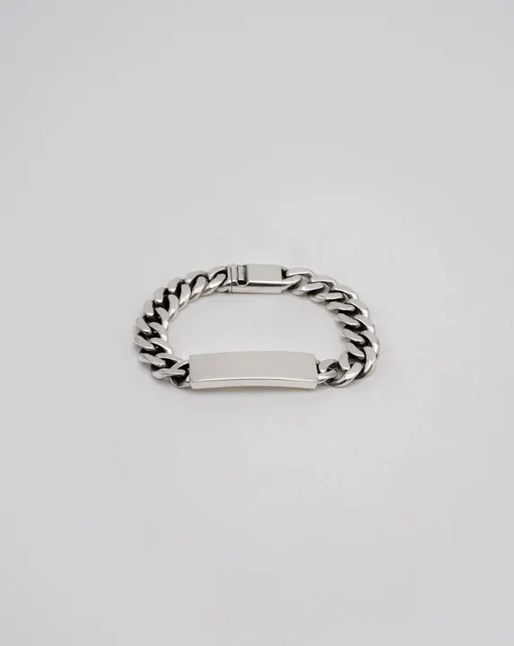 "Chain" series 人気の"Chain" plate ringのデザインをそのまま大きくし、モダンかつ大胆なスタイルにアップデートしたチェーンブレスレット。 重厚感あるSILVER925(sterling silver)にプレートをあしらい、アイコニックな雰囲気を演出しました。 シンプルな服装の日のアクセントとしての活用も、もちろんですが、同シリーズのアイテムとのトータルコーディネートもおすすめです。