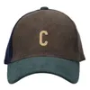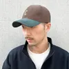 アシンメトリーに生地を切り替えたコーデュロイローキャップ。フロントの文字はフェルトワッペン。フロント面にハード芯を貼った型崩れしにくい帽子。