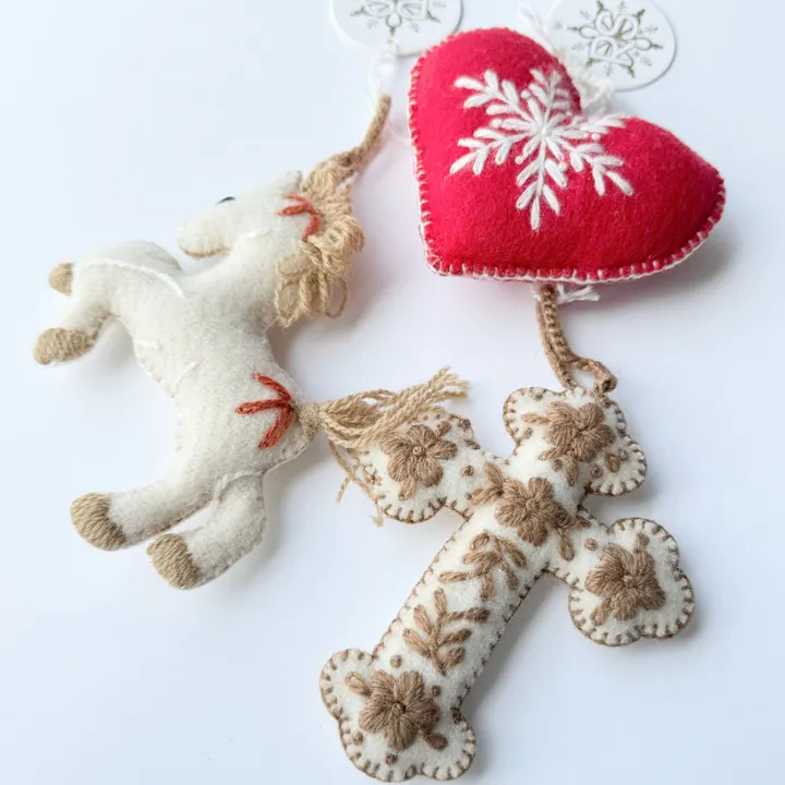 クラシック&シンプルにクリスマスを。 クリスマスらしい色のフェルト生地にやさしいハンドステッチが光る、クリスマスオーナメントの3点セットです。 ・ハート ・スター ・リース 裏側は無地です。 ペルーの地方に暮らす女性たちが手作りしています。 ■素材:ウール ■サイズ:縦・横巾 約10~12cm ■お手入れについて 丸洗いはできません 【注意事項】 全て手で作成する工程を含むため、サイズが若干異なる可能性がございます。 記載されているサイズはおおよその目安として参考にしてください。