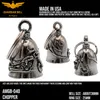 アメリカ製ガーディアンベル社製ガーディアンベルです。 MADE IN USA アメリカ製 交通安全 魔除け 御守り ガーディアンベル アメリカのライダーの間には、事故や、転倒の原因は「道路にひそむ悪魔」によるいたずらだという伝説があります。悪魔は走る者に悪戯やトラブルを運んできます。このベルは美しい音色で悪魔たちを追い払うと言われ愛されています。そんな悪魔のいたずらを防ぎ、御守りとなるのが、守護者のベルという意味を持つガーディアンベル。 日本でも鈴の音(ね)は神道では魔除けの音と言われています。ピューター製の鈴でいい音色でガーディアンベルはデザインも様々あります。 またガーディアンベルにまつわる伝説として、プレゼントとして送られたベルの効果は、自分で手に入れたものの2倍になると言われています。 それゆえに彼氏・彼女・友達・家族へのプレゼントとしての人気も非常に高まっています。 シルバーアクセサリーのようにおしゃれに装着できて素敵な音色を奏でるガーディアンベル。 バイカー以外にも自転車や旅・交通安全のお守りとしてお使いいただけます。 カバン・ランドセル・キーホルダー・ペットの首輪等に付けてお使いください!! ※タイラップ等でバイクのフレームにも簡単に取り付けできます。 アメリカンモデルだけではなく、旧車ファン、レプリカライダーまで、さらにバイクだけでなく、自転車や車にもピッタリな御守りとなっています。 アクセサリーとしても人気で、アイディア次第で車体だけでなく、キーホルダーや鞄など、どこにでも付けておしゃれに楽しめます。
