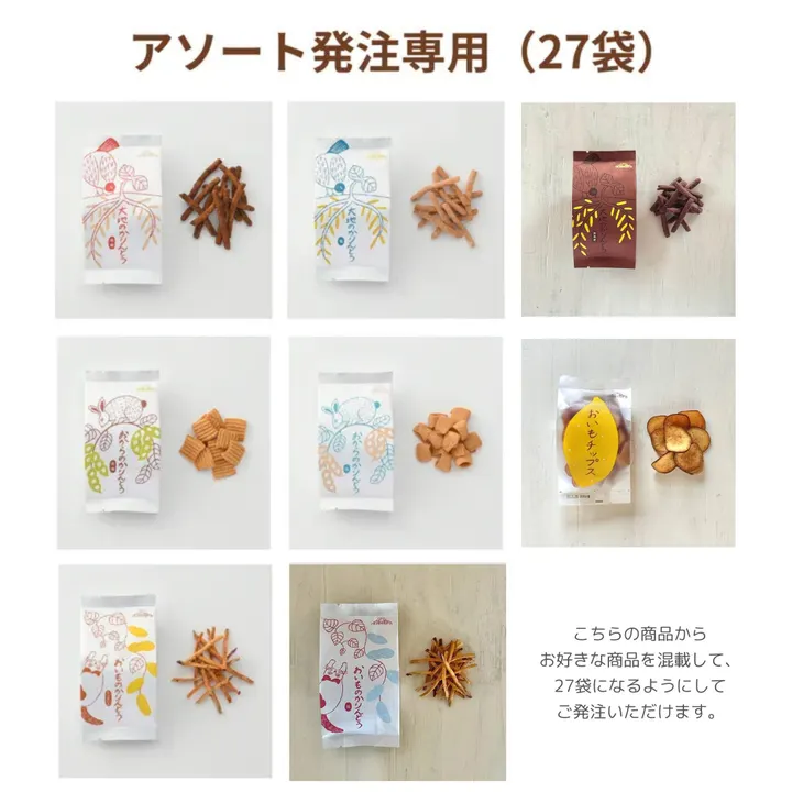 大地のおやつの人気かりんとうシリーズ混載で、27袋になるように選択できます。 出荷の都合上、複数の味の合計が27袋単位(27, 54, 81袋・・・)になるようにご注文ください。 商品ごとに関する詳細は、各商品ページをご参考ください。