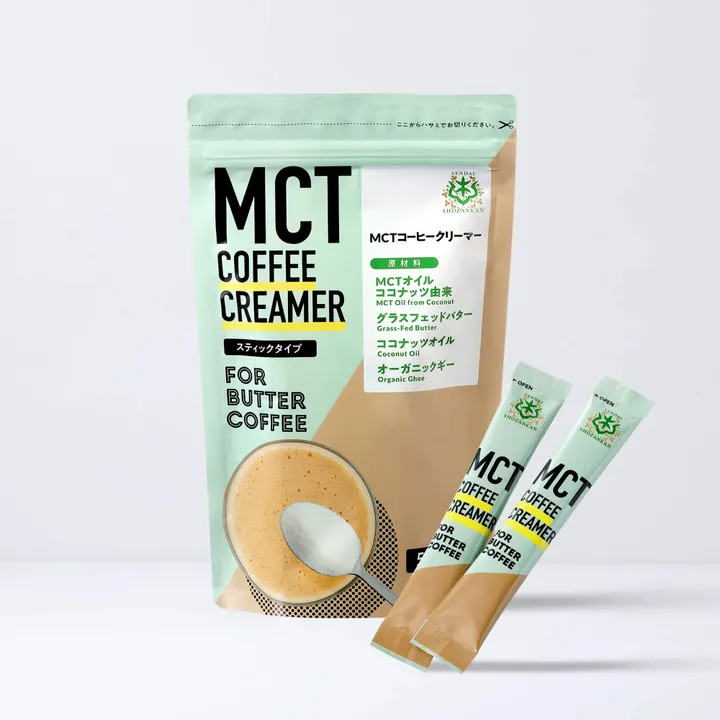 スティック1本で簡単・美味しい 当店2番人気「本格バターコーヒー」の素 「バターコーヒー」とはブラックコーヒーにグラスフェッドバターorギーとMCTオイルを混ぜたコーヒーのこと。 体脂肪になりにくい「置き換え食」としてダイエッターに人気のドリンクです。 MCTコーヒークリーマーならお好みのコーヒーに混ぜるだけ。 成分の約70%を厳選された良質な脂質(ココナッツ由来MCTオイル、グラスフェッドバター、ココナッツオイル、オーガニックギー)で構成。 MCTオイルの中でもより素早く消化・吸収されやすい「C8(カプリル酸)」のみを贅沢に使用しています。 空腹感を感じづらく素早くエネルギーになるので、食事の置き換えやおやつ代わりにぴったり。