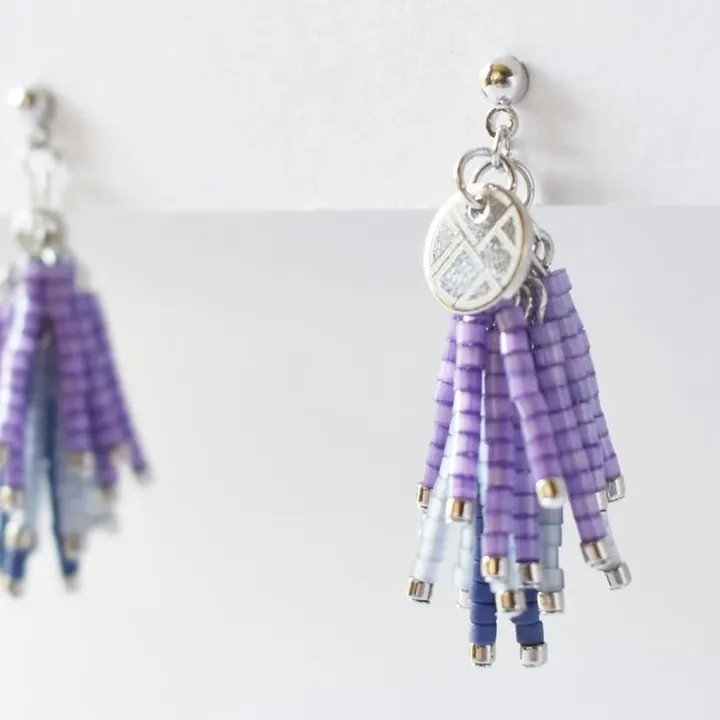 藤の花を連想させる花をもつクサフジ 無数に咲き誇るその花のグラデーションは 目を見張るほどに美しいものです マメ科の植物のため 羽状の葉をつけます *こちらは【mini】サイズの商品です。 material SILVER925(ピアス金具)、SILVER925 ロジュームメッキ(イヤリング金具)、ガラスビーズ、銀糸、真鍮、チタン、シリコン *シルバービーズはパラジウムメッキ加工を施したものを使用しております *取り付ける金具によって、使用している金属が異なります size 約13x46mm weight 約2.3-3.4g *取り付ける金具によって、重さが異なります *CACICOの商品は全て1点1点制作しているため、個体差があり、商品写真と差がある場合がございます。ご了承の上、ご購入ください。 *金属アレルギーの方はご使用をお控えください *受注生産のため、ご注文確定後1週間〜10日以内に商品を発送いたします