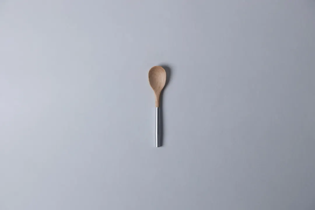 弁当箱のデザインと同じく、木と金属のコントラストが、なんともかわいいスプーン。木部と柄を分離させれると、弁当箱の蓋の上にちょうど収まるサイズです。木部は口当たりが柔らかい木質材を使っています。