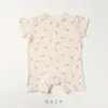 遊び心のあるオリジナルのエビ柄ロンパース -素材の特徴- 伸縮性のある柔らかなコットンフライスを使用。 肌触りも良く着心地も抜群です。 -デザインの特徴 めずらしいエビをモチーフにしたオリジナルプリント。 ニュアンスカラーと踊っているようなエビ柄が他にはないデザインです。 肩のスナップで衿元が大きく開くのでお着替えもしやすく、 股部分のスナップでオムツ替えも簡単にできます。 -ポイント- デザインから生産まで全て日本で作られている'All made in Japan' 職人さんが手作業で印刷を施す’手捺染(てなっせん)’という印刷技法を採用。 機械では出せない色味ややさしい雰囲気に仕上がっています。