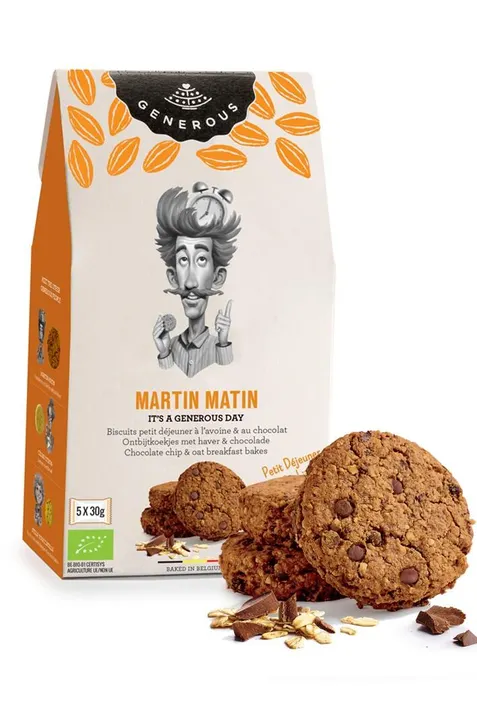 グレートテイスト賞受賞・グルテンフリーのおいしさ! パッケージ・デザインで描かれているイラストは、『GENEROUS』のスタッフがモチーフになっています。 オーツ麦にチョコチップとレーズンを加え、動物性原料を使わずに焼き上げました。ブレックファーストベイクとして忙しい朝の栄養補給に。おやつに。個包装で便利。 RSPO認証の有機パーム油使用。 GENEROUS / ジェネラス クッキーシリーズは、すべて1ケース8個入となっておりますが、6種類あり、合計で5ケース(40個)から発送可能でございます。