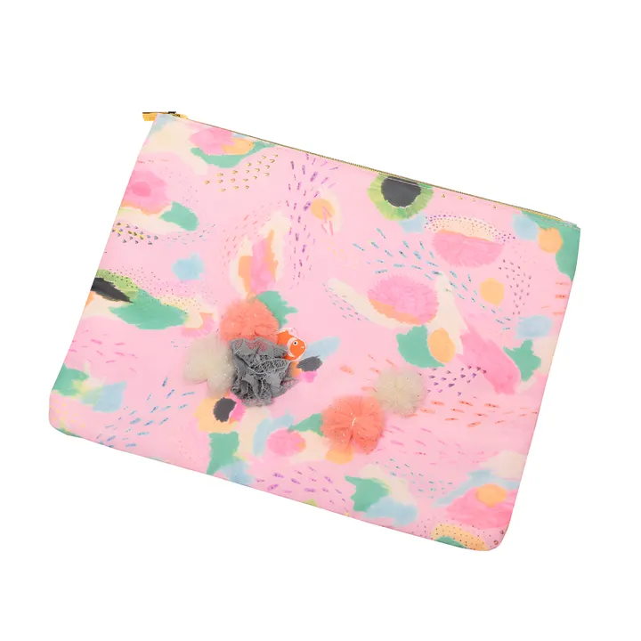 トランクに入っているだけでバカンスがより楽しくなりそうな、カラフルなデザインが特徴のカクレクマノミシリーズです。 華やかな色のプリントにポイントであしらったフリルのサンゴと、その影から顔を覗かせるクマノミがとても可愛らしい仕上がりです。 大きめサイズのポーチはクラッチとして持ったり、タブレットやラップトップケースとして最適です。 ※正規の電子機器ケースではございませんので自己判断の上ご使用ください。