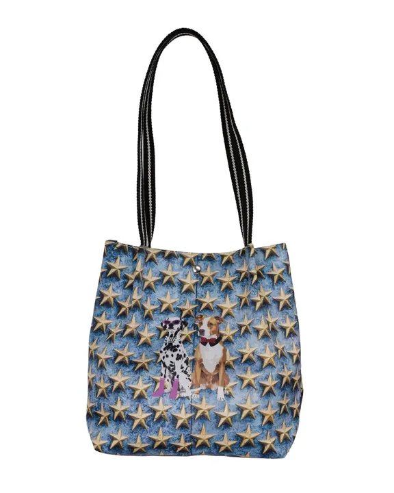 ティピィカレン スクエアタック付けダブルハンドルショルダーバッグ。 光沢感あり、発色がよく、高級感のある素材感が魅力です。 タペストリーやカーテンなどのインテリアファブリックで、生地の厚みや硬さ、強度などが高くバッグとして扱いに適している素材です。撥水ではありませんが水にも強いです。 片面はブルーベースにスタースタッズの生地の画像を染めて立体感のある表面に、エレガントなペアドッグ、もう片面はピンクベースにtipicurrenの人気モチーフparkモチーフをデザイン。 軽やかなお散歩で、楽しくなるバッグをイメージしてみました。 15mmのラインテープも厚みもあり、硬さもあるしかっりしたテープですので、しっくりくる仕様です。 タック付けでバッグの表面丸みがつくデザインは、優しいフォルムで女性らしいやさしいラインが出ています。 少し長めの持ち手ですのでどんなスタイルにも合わせやすく、小ぶりなサイズも、マチがありますので見た目以上に収納力抜群です。 裏地はコットンで切ポケットを2個付け、幸せワードプリントし楽しくなるバッグを目指してます。開口部はマグネットホック止めになります。 全体の重さは200gでとても軽いバッグです。 素材やパーツなどもこだわり、プリント、縫製もこだわりながら、日本製で丁寧な仕上がりです。 両面の印象が変わるようプリントを変えて、どちらの面を気分で使い分けしたくなる楽しさがティピィカレンバッグの特徴でもあります。 ファブリックバッグの良さを追求し、オリジナルテープを使い、個性的で、高級感もあり、実用的なバッグとして是非お試しください。 デジタル染色とは デジタルデータをインクジェットプリンターにより、高精細に描画し昇華転写染色の技術により布を染色する加工方法。 使用する染料インクは顔料系インクとは違い、布の風合いを損ねず色落ちなどもほとんどありません。 分散染料による熱転写染色方式のためポリエステル素材への染色となります。 高発色、高精度のオリジナルテキスタイルに仕上がっています。