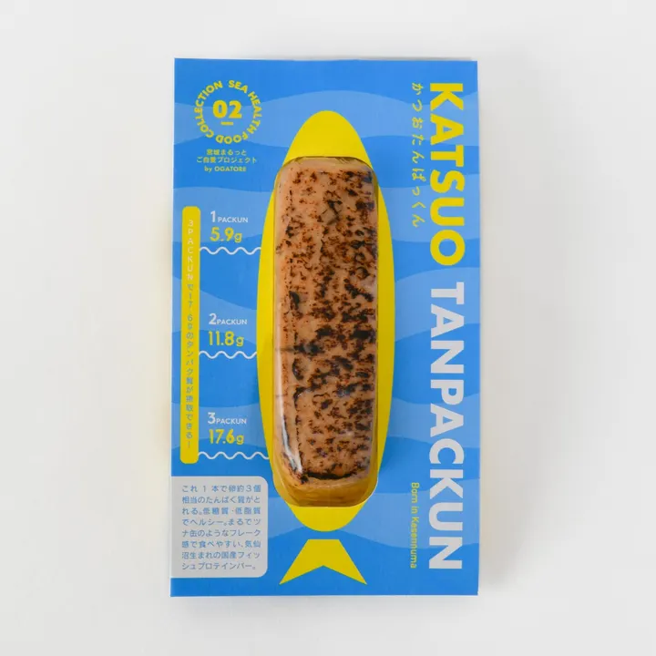 「かつおたんぱっくん」は、新鮮な魚肉を使用して作られた、栄養価の高いプロテインバーです。健康的な食生活を送りたい人や、スポーツ選手、ジムでトレーニングを行う人だけでなく魚を食べる機会が減っている老若男女、幅広い層の人々におすすめです。 ◆低糖質(1.8g)・低脂質(1.0g)・低カロリー(87kcal)で高たんぱく質(17.6g)で美味しい! ◆常温保存可・6か月持つのでアウトドアや、非常時の備蓄にも最適 ◆鮮度の高い魚肉を使用:フィッシュプロテインバーは、国産(宮城県産)の新鮮なカツオを使用しています。厳しい品質管理の下で生産された、健康に配慮したプロテインバーです。 ◆17.6gのプロテイン含有:1本60gあたり17.6gのプロテインを含有しており、健康的な食生活を送るために必要な栄養素を摂取することができます。 ダイエットやトレーニングに最適:低糖質、低脂肪、低カロリーでありながら、栄養価の高いフィッシュプロテインバーは、ダイエットやトレーニング中にも適しています。 美味しさと食感:味や食感にもこだわったフィッシュプロテインバーは、一般的なプロテインバーとは違い、カツオの旨みとまるでツナ缶を食べているようなフレーク感を楽しめます。 おすすめの食べ方 そのまま、ぱっくん。 時短おかずの一品に ホットサンド風でもっとおいしい(加熱に対応) *原料(カツオ)の状況により生産が間に合わなくなり売り切れる場合があります 100g中に約30gのタンパク質を含みます。 ✅常温保存可・約6か月持つのでアウトドアにも ✅鮮度の高いカツオの魚肉を使用! ✅生鮮カツオ水揚げ日本一の宮城県気仙沼市からお届け! ✅低糖質(1.8g)・低脂質(1.0g)・低カロリー(87kcal)で美味しい ✅添加物不使用:合成着色料や保存料を一切使用しない、自然そのままの風味。 ✅環境に優しいパッケージ:紙材や簡易包装を心がけ、持続可能なパッケージング。 ✅ヘルシーレシピも:さまざまな食事法に活用できます ✅1日800本完売の人気商品 ✅日経MJに掲載 ◆栄養成分表示(1本60gあたり)※推定値 エネルギー:87g タンパク質:17.6g 脂質:1.0g 炭水化物:1.8g 食塩相当量:0.4g