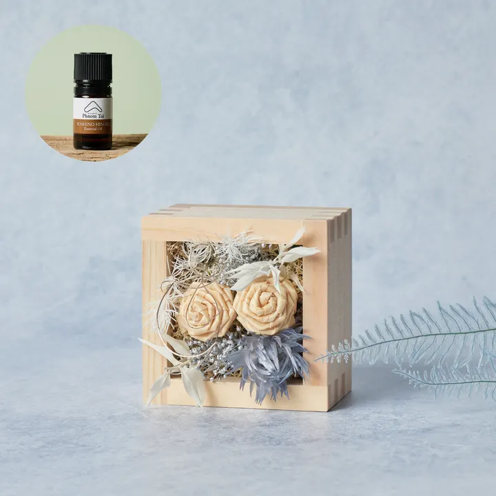 フラワーディフューザー:ヒノキ枡、ヒノキかんな屑、プリザーブドフラワー、ドライフラワー 精油(吉野ヒノキ)
