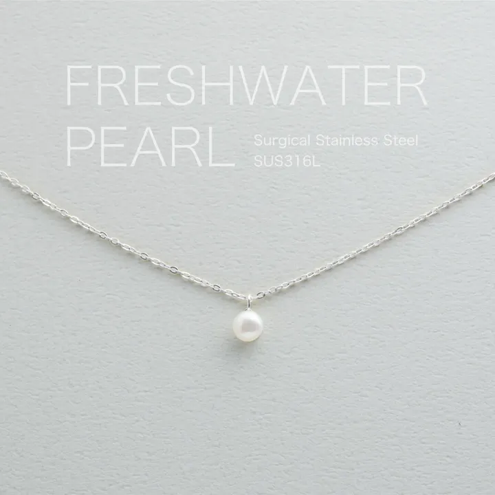 つけていることを忘れるほど軽く、肌に優しいストレスフリーのスキンジュエリーです。 ゴールドとシルバーからお選びいただけます どんなスタイルにも合わせやすいシンプルなネックレスは、自分へのご褒美はもちろん、ギフトや大切な人へのプレゼントに喜ばれます。 ⚪︎汗に強い淡水パール 淡水パール(淡水真珠)は、本真珠の一種です。淡水性の二枚貝を母貝とします。 川や湖で養殖されたものが主流で、3〜7年と長い年月をかけてつくられることで真珠層が厚くなるので、 耐久性が高く汗に強いという特徴があります。 ⚪︎カジュアルな高級感 淡水パールは天然の宝石として高品質なものがありながらも、比較的手頃な価格で入手できます。 高級感がありながらも、予算内で購入できるのが魅力です。 ⚪︎環境に優しい淡水パール 淡水パールは、採取過程で環境に与える影響が比較的少ないとされていて、 環境に優しい持続可能な選択として注目されています。 ⚪︎つけっぱなしOK!サージカルステンレスネックレス(SUS316L) アクセサリーに使用されるステンレスの種類の中でもSUS316Lは医療器具にも使われるほど人体にやさしいステンレスです。 汗や水に強く、海やプール、温泉でも変色や劣化しにくく、つけっぱなしにしても失敗のない素材です。 金属表面の不動体皮膜が金属と肌が直接触れるのを防ぐので金属アレルギーの方やそうでない方にもおすすめです。 ネックレスチェーン、アジャスター、台座の全ての金属パーツが安心のサージカルステンレスSUS316L製です。 ⚪︎K18仕上げ ゴールドタイプはサージカルステンレス(316L)にニッケルフリー18金メッキが施されています。 更に樹脂コーティングすることで18金が剥がれにくく、金属と肌が触れないように配慮された特別仕様の素材です。 ⚪︎お手入れ方法 普段のお手入れは柔らかい布でほこりを拭き、風通しの良い場所に保管してください。 汚れが気になるときは、薄めた中性洗剤や水で軽く洗い、直射日光を避け完全に乾くまで干してください。 ○環境への配慮 付属のジュエリーボックスに再生紙を使用しています。ギフト用にもふさわしいお洒落な質感と環境への配慮を両立したボックスです。 淡水パール サイズ:5mm ネックレス金属パーツ シルバー:サージカルステンレス(SUS316L) ゴールド:サージカルステンレス(SUS316L),ニッケルフリー18金メッキ, 樹脂コーディング