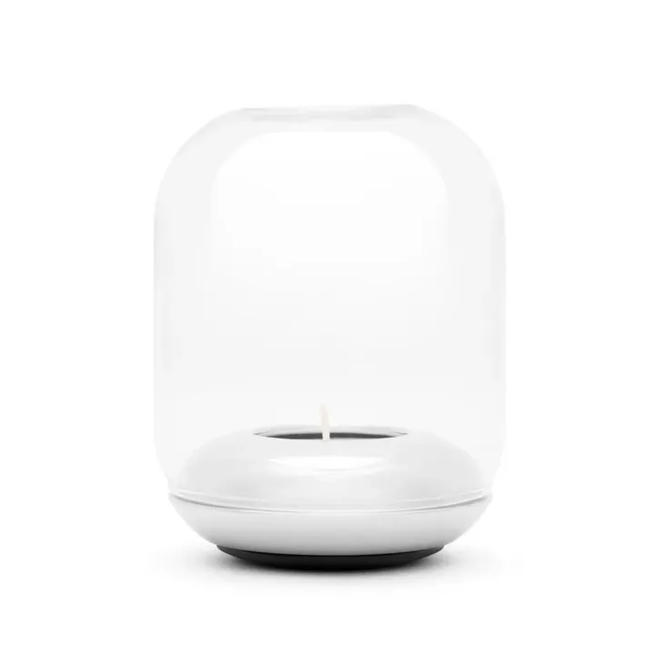 提灯から着想を得たデザインで、手吹きガラスのカバー、亜鉛製ベース、プラスチック製の底カバーの3つで構成されています。キャンドルはベース内に収まり、ガラスカバーが風を防ぎながらやわらかな灯りを演出。リビングやダイニング、テラスや庭など、場所を選ばず静かで落ち着いた雰囲気を生み出します。
