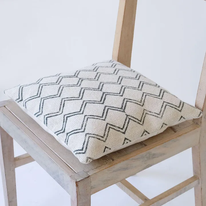 分厚いキャンバスにブロックプリントが施されたシリーズ。 モダンな柄展開で柄違いで揃えたくなる一点です。 ほど良い厚みと弾力があり、ダイニングチェアでの使用はもちろん、床に座る際のクッションとしても使えます。 **BLOCKPRINT** ブロックプリントとは、木彫りの版でハンコを押すように 1柄ずつ1色ずつプリントされたものです。 まずは、アウトラインとなる柄のスタンプを押していき、その後色をのせていきます。 使われている色の数だけ、作業は複雑になっていきます。 全て手作業の為、染めムラやスタンプの境目などが少し出ていますが それがブロックプリントの良さでもあり、風合いとなっております。 機械化が進むこの時代にこの風合いをぜひお楽しみ下さい。 【インテリア】【クッション】【ブロックプリント】【動画】【D】