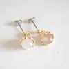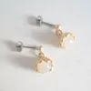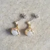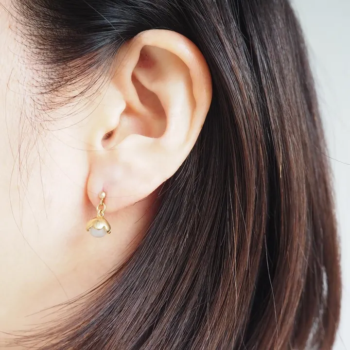 イヤリング【Swing】/スカラップフレーム6mmムーンストーン*キヘイチェーン2wayイヤリング(取り外し可能) 波状の「スカラップ」フォルムと共に メタル素材と天然素材のコンビネーションをナチュラルに楽しむアイテム 連続した半円の波状の縁取りデザイン ホタテ貝の意を持つ「スカラップ」と呼ばれるフォルムを活かし 明るいトーンを纏う天然素材と金属素材とのコンビネーションと ナチュラルなテイストを大切に表現したイヤリング&ピアス 個々の色味の違いや表面の凹凸感など、天然素材ならではの表情を楽しめる淡水パールと ふんわりと浮かび上がるような光を纏う天然石のムーンストーンをチョイス それぞれのナチュラルな魅力にメタルの輝きと揺れ感を添えながら 自然体なムードをやさしく散りばめた作品です ////////////////////////////// 天然素材の表情を上品に引き立て ほんのりと甘さを添えるスカラップデザイン ////////////////////////////// 半円が連なり生み出されるウェーブ模様の『スカラップ』 その様子がまるでホタテ貝を並べたように見えることから「scallop」(英=ホタテ貝)と呼ばれています。 多くは衣服の裾や襟ぐり、袖口や、小物の様々な縁取りのアクセントとして施されることの多いスカラップ模様を オリジナルの枠として一からデザイン。 アクセサリーの小さなデザインの中にもリズミカルな模様が丁寧に表現され 淡水パールやムーンストーンの天然素材に上品に調和し愛らしく引き立てる Oucaらしいオリジナリティが光るひとしなに仕上がりました。 ◆詳細◆ 『スカラップフレーム淡水パール8mm』のモチーフより一回り小さな6mmサイズの天然石ムーンストーンがぴったりおさまる スカラップ模様で縁取ったメタル枠をオリジナルの原型として作成。 ムーンストーンにそっと沿うような端正なフォルムと素材を邪魔しない薄さにこだわりながら、 その魅力を損なうことなく引き立てるメタル枠をイメージし、ムーンストーンとメタリックの見え方がちょうど半々くらいとなるよう仕立てました。 主張し過ぎず、ムーンストーンにしっくりと馴染みその魅力を際立たせる好バランスのスカラップ模様は、オリジナルならではの絶妙な仕上がりです。 その小ぶりなサイズ感と、お花や実を思わせるようなスカラップ模様の曲線とムーンストーンのコンビネーションがダイレクトに楽しめるよう 淡水パールのモチーフとは枠の向きを変えデザイン。 正面から見た時にはマットなゴールドカラーのスカラップ枠とそこから覗くまろやかな乳白色のムーンストーンの色合いや質感のミックス感、 また柔らかな輝きとナチュラルさを引き立てるようにメタル部分の表面に施した筋目のテクスチャーなど、 コロンとした魅力的なモチーフの立体感を様々な角度から楽しめます◎ スカラップ模様で縁取ったメタル枠と組み合わせることで、優しいムーンストーンの表情にほんのりと甘さ漂う女性的な雰囲気が相まって、 小さなモチーフのなかに「かわいい」がギュッと詰まったチャームに仕上がりました。 こちらはモチーフのデザインを存分に楽しめる、揺れるタイプのピアス。 コロンとした丸型に近いフォルムの小ぶりなモチーフが、耳元で小刻みに揺れるシンプルなデザイン。 スカラップ模様のメタル部分とそこから覗くムーンストーンのコントラストが魅力的なモチーフを、全方位からご堪能いただけます◎ 淡水パールデザインより一回り小さくモチーフの向きも変わることでまた違う上品さやほんのりとした可愛らしさを醸す、様々なシーンで広く頼れるデザインです。 モチーフの取り外しが可能な2way仕様のイヤリングタイプ(EN168)もございます。 商品には専用のBOXが無料で付属しますので、ギフトにも最適です◎