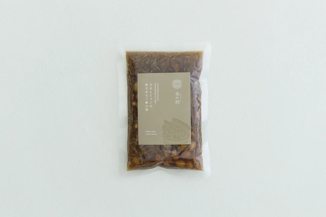 丁寧につくられた自家製だしをベースに、上質なちりめんじゃこと国産大豆をたっぷりと使用した贅沢な炊き込みご飯の素。 アクセントの実山椒が香りと味を引き立てます。 お米と一緒に炊くだけで素材の味わいを頬張れる一品です。 化学調味料・合成保存料無添加。 ○原材料名:大豆(国産)、だし(小麦醸造調味料、じゃこだし、醤油、 粗糖、清酒、厚削り節、花かつお、さば節、うるめ節、昆布だれ、食塩)、 じゃこ、みりん、じゃこだし、清酒、昆布だれ、実山椒 ○内容量:200g(2~3合用) ○アレルゲン:小麦、大豆、さば、りんご ○保存方法: 【開封前】直射日光を避け、常温で保存して下さい。 【開封後】開封後は、冷蔵庫にて保存してお早めにお召し上がり下さい。
