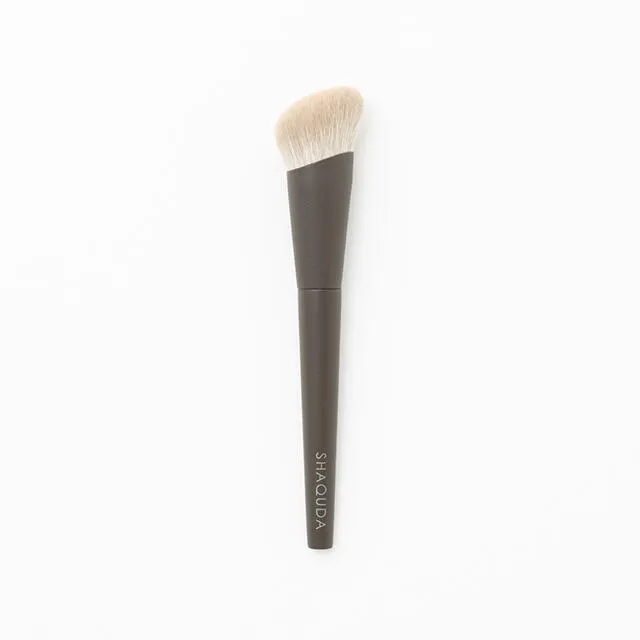 角度を付けた金具としずく型の穂先を組み合わせた3D形状が斬新なファンデーションブラッシュ。山羊毛と人工毛を絶妙にブレンドした穂先はどのファンデーションとも好相性。密度のあるソフト面は顔全体を均一に仕上げ、しずく型の先端部分は細部をしっかりカバーします。ハンドルの裏面には、置いた時に転びにくいシャープなカットを施しています。