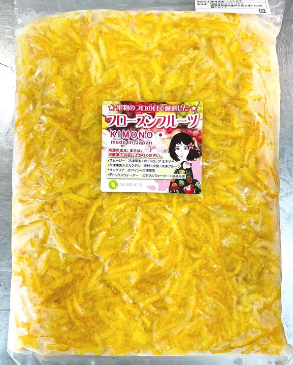 NORUCAが展開する「KIMONO FRUITS」は、プロのパティシエや飲食店から絶大な信頼を寄せる高品質の業務 用冷凍フルーツブランドです。「瞬間凍結。鮮度。プロが選ぶ『KIMONO FRUITS』の特徴は、急速冷凍技術。 フルーツの細胞をできるだけ壊さず、採れたての鮮度・色・香りをそのまま閉じ込めているため、生果のような 瑞々しさが楽しめます。地元・徳島産のすだち、ゆず、いちご等を中心に、世界中から厳選したフルーツを、 衛生管理のもと自社工場で加工 しています。 果物のプロの目で厳選した冷凍フルーツ ノーワックス じゃばら皮 和歌山産 じゃばらの皮をスライスカッ トし、短い旬の美味を凍らせました。真空パック加工後、急速冷凍していますので、じゃばら本来の風味と味覚 が楽しめます。じゃばら皮の部分には、ナリルチンという成分が豊富に含まれていると言われています。「邪 (じゃ)を払う」からその名がついた、和歌山県の幻の柑橘、じゃばら。 実は、健康成分『ナリルチン』が最も 豊富に含まれているのは、果汁ではなく「皮」の部分です。 このじゃばらの皮を贅沢にスライスし、使いやすく 仕上げました。 季節の変わり目のムズムズ対策や、日々の体調管理に。自然のチカラをまるごと取り入れてみま せんか ? ※じゃばら皮スライス 使い方 花粉対策に 、皮のスライスを水に入れて、じゃばらウォーターや、紅茶に浮かべるだけで、心安らぐビターな香 りが広がります。お疲れ気味の夜には、はちみつ漬けをお湯で割ってホッと一息。 「良薬は口に苦し」と言いま すが、この苦味こそが美味しさと元気のヒミツ。 おしゃれに、健やかに。じゃばらのある生活を始めてみません か?お料理に、じゃばら大根、浅漬けにまぜたり、フルーツカクテル、フルーツウォーター用のフルーツとして、  冷凍フルーツ 国産じゃばらは、注目を浴びています。