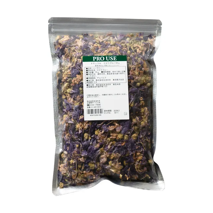アントシアニン色素が抽出され、鮮やかなブルーが美しいハーブティー。 酸性のレモンを入れてピンクに変わる、ロマンティックな飲み物です。 和名:ウスベニアオイ。 受注生産品は出荷まで7営業日程度いただいております。