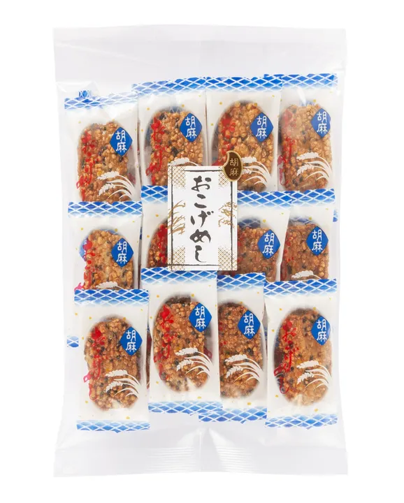 昔ながらの懐かしい味・・・・ 釜戸で炊いたごはんの底には「おこげ」。そんな「おこげ」のようなせんべいです。 胡麻の風味豊かなパリッと香ばしい「おこげめし」せんべいです。 リピート率も高い、人気の商品です!!