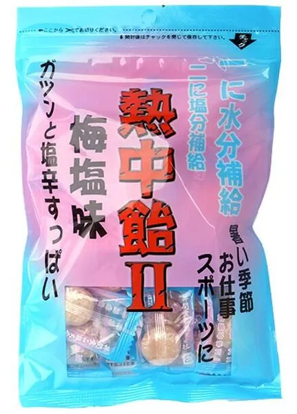 暑い時節は外での仕事や運動により汗をかきます。そんな時に必要なのは水分、その吸収を助ける塩分を補給すること。 手軽に熱中症対策ができると大人気の熱中飴に待望の梅味が登場しました。 試作段階から人気の高かった梅味。クエン酸配合のすっぱ甘い梅味はくせになりそうなおいしさ。 「熱中症対策の飴をつくってほしい」という建築会社様からの要望から生まれた熱中飴は、夏の熱中症対策にかかせない一品です。