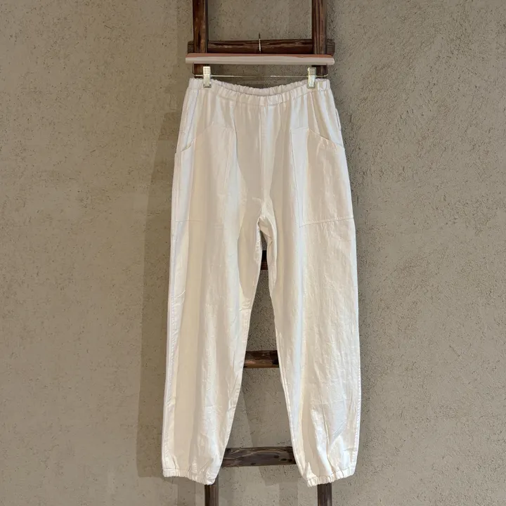ヘンプ55%、オーガニックコットン45%、 薄手のキャンバス生地を用いたユニセックスパンツです。 サラッとして柔らかく、肌触りも良い着用するほどに肌になじむ ナチュラルで気持ちが良い丈夫で軽い生地を使用しております。 足上げなどがスムースで、動きやすく無駄のないすっきりしたデザイン。 体型に応じて、品よく美しく、またワイルドに着用でき、 カンフーやヨガなどのボディワークや部屋着、外出着、 ワークウエアなどにもゆったり気持ちよくご着用いただけます。 両脇前後に使用しやすワイドパッチポケット。 ウエストは全周に平ゴム、平ひもで調整が可能で、 手拭いやカラビナなど掛けれるループも特徴のひとつ。 季節を問わず、着用いただけます。
