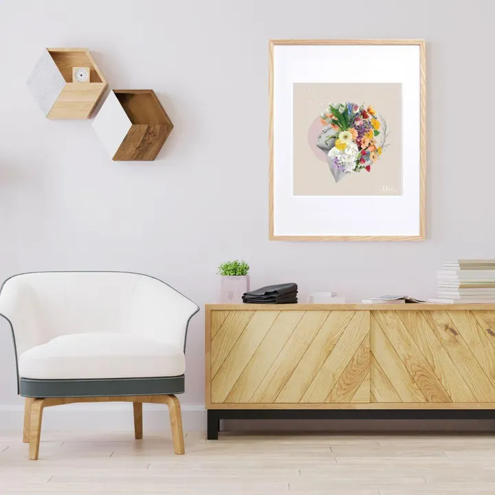 【現代アートポスター】女性 花 シンプル 写真 おしゃれコラージュ A2(L) フレームセット:無垢 56.1×74.3cm