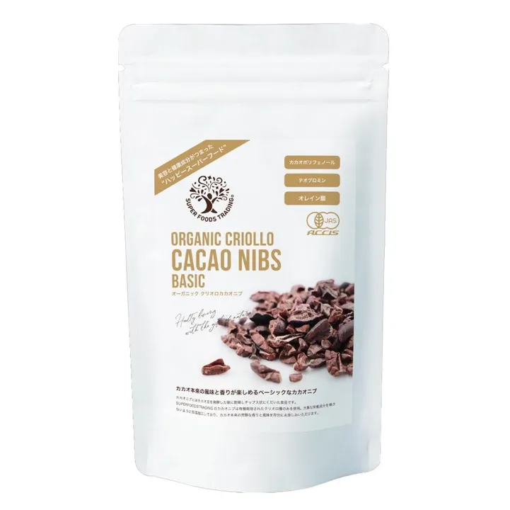 ★カカオ本来の風味と香りが楽しめるベーシックなカカオニブ★ カカオニブとはカカオ豆を発酵した後に乾燥しチップス状にくだいた食品です。 SUPERFOODSTRADINGのカカオニブは有機栽培されたクリオロ種のみを使用。大事な栄養成分を壊さないように45℃以下の低温で加工しており、カカオ本来の芳醇な香りと風味を存分にお楽しみいただけます。 [オーガニッククリオロニブのこだわり] ●カカオ豆を45℃以下で低温加工し砕いたピュアなカカオチップ ●ナッツのような食感でカカオ本来の風味と香りが存分に味わえます ●オーガニックカカオ豆はクリオロ種のみ使用 ●砂糖・乳製品・動物性原材料・食品添加物(香料/甘味料/着色料等)不使用 ●有機JAS認証取得済 [原材料名] オーガニックカカオニブ [内容量] 100g  [原産国名 ] ペルー  [商品サイズ] 縦200×横120×奥行10mm [栄養成分表示]1袋(100gあたり) エネルギー557kcal・たんぱく質10g・脂質44.5g・炭水化物38.5g(糖質19.6g、食物繊維18.9g)・食塩相当量0g・マグネシウム249mg・鉄2.7mg・ポリフェノール3810mg・テオブロミン870mg・オレイン酸17g・カフェイン0.22g [賞味期限] 2027年11月10日 [保存方法]直射日光・高温多湿を避け、涼しいところで保存してください。 [おすすめのお召し上がり方] ●そのまま手軽にスナックとして召し上がれます。 ●アイスクリーム・かき氷・スムージー・ヨーグルト・グラノーラなどのトッピングにオススメです。ナッツのようなポリポリとした食感が良いアクセントになります。 ●チョコレートと違い、加熱しても本品は溶けることは御座いませんので、製菓材料としてパンケーキやパンなどの食感のアクセントにご使用頂けます。