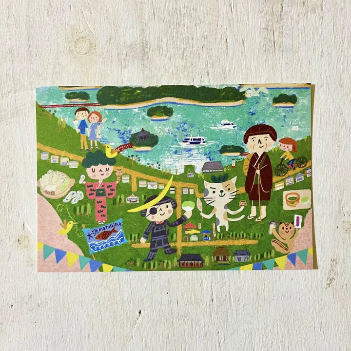 松島絵柄の ポストカード。 額に入れて飾っても楽しめます!! 松島(宮城県)は、260余りの島々が浮かぶ日本三景の一つで、 その絶景で知られる風光明媚な観光地。 松島の海岸通りをベースに、政宗、松尾芭蕉と 松島イメージのねこちゃんを入れた絵柄のポストカード。 バリエーションがあります。 横150mm×縦100m 上質紙 オフセット印刷 *PCモニターやスマホ画面と色が違って見えることがありますので、 ご了承お願いいたします。